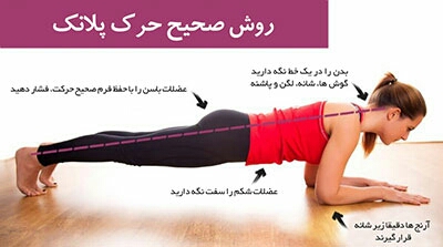 ۱- ابتدا ارنج و و زانوها را روی زمین بگذارید و وزن بدن را روی ساعد و زانوها قرار دهید. ۲-عضلات شکم را سفت کنید تا مانع از بالا و یا پایین آمدن باسن شود. ستون فقرات باید با زمین موازی باشد و و عضلات شکم را به سمت سقف هل دهند.