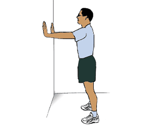 شنا با دیوار در مقابل دیوار قرار گرفته پاها را به اندازه عرض سرشانه باز نمایید و با خم کردن ارنج صورت و سینه را به دیوار نزدیک کنید. تمرین را ۳۰ ثانیه انجام دهید سپس ۱۰ ثانیه استراحت کنید و در انتها تعداد حرکت صحیح را ثبت کنید